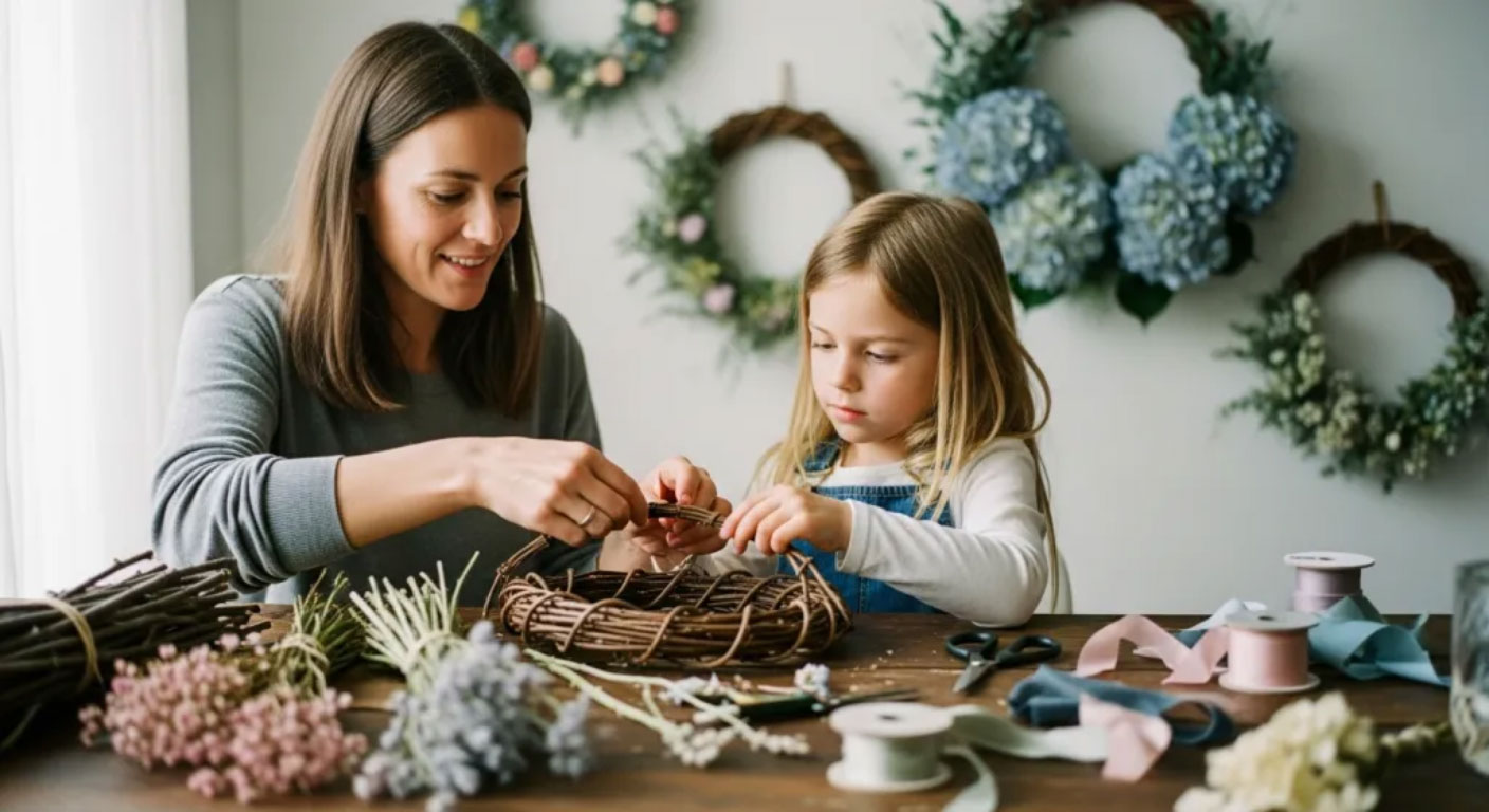 Guirlanda artesanal vibrante que celebra a renovação da primavera. Com uma rica composição de flores permanentes em cores alegres e suaves, é a peça ideal para transformar sua porta em um convite ao acolhimento e à luz.