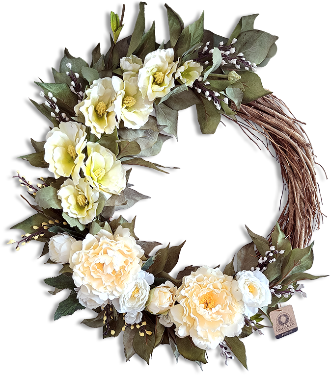 A guirlanda Claire de Lune foi criada para quem busca uma decoração elegante e atemporal. Sua composição reúne flores em tons de creme e branco, que se destacam delicadamente sobre uma base de folhagens em verde suave. Dessa forma, cria-se um contraste equilibrado que valoriza cada detalhe da peça.