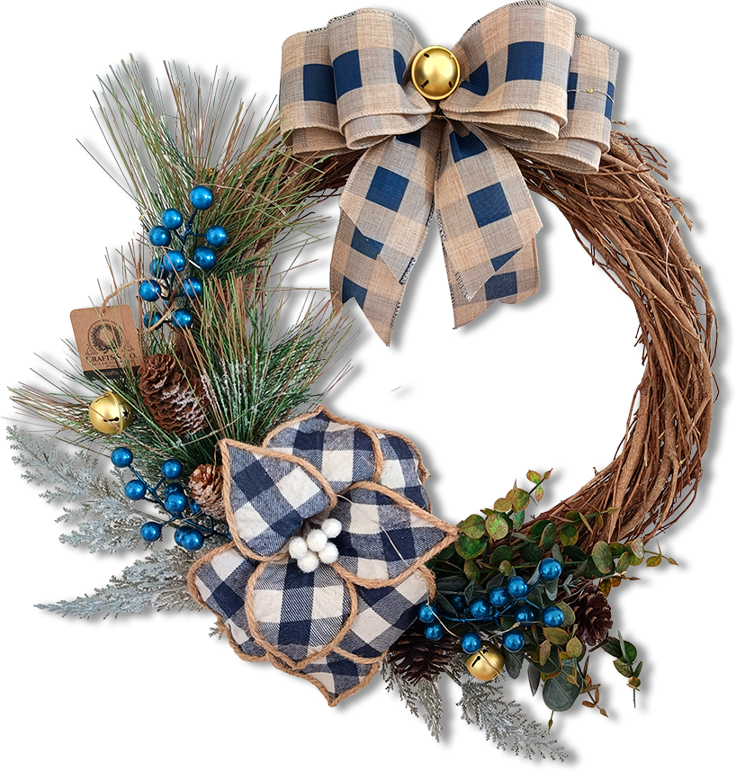 Depois, a Poinsétia elaborada manualmente em tecido xadrez cria uma flor atemporal que não se desgasta com o tempo. Além disso, o contraste entre o tecido e a borda em juta adiciona profundidade e presença visual. Enquanto as bagas metálicas azuis introduzem um brilho equilibrado, o verde das folhas, o eucalipto e as pinhas naturais trazem aconchego e textura. Por fim, o laço xadrez no topo se une ao sino dourado para concluir a composição, não como mero detalhe, mas como assinatura de estilo.