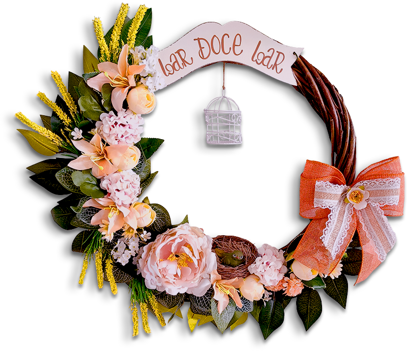 A Guirlanda Serenità, esta escultura floral celebra tons outonais suaves: terracota, mostarda pálido, verde-oliva. Flores em camadas criam profundidade. E no centro, uma plaquinha de madeira natural pintada à mão com a frase “Lar Doce Lar” — não uma frase feita, mas uma declaração de intenção.