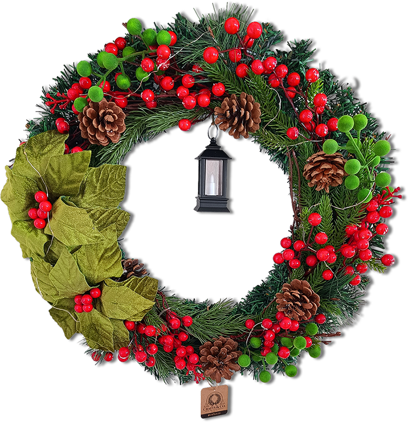 Depois, as bagas vermelhas vibrantes se espalham ao longo da guirlanda, conversando com as bagas verdes texturizadas. Além disso, as pinhas naturais equilibram o brilho das esferas com uma rusticidade calorosa. Logo abaixo, as folhas de Poinsétia em veludo verde-oliva ampliam a sensação de riqueza visual, conferindo profundidade e presença estética.